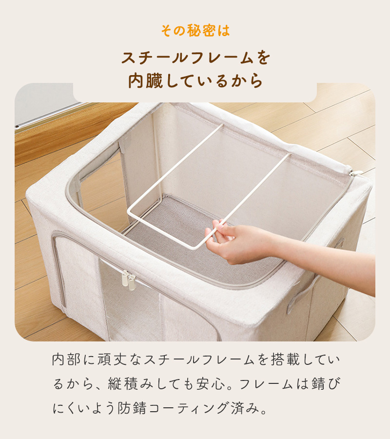 内側はスチールフレームでしっかりと形をキープし、重ね置きしても崩れにくい設計。