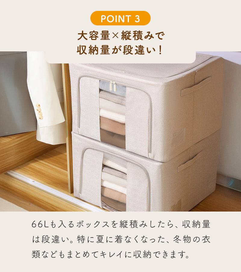 3. 大容量66Lで衣類や寝具などたっぷり収納